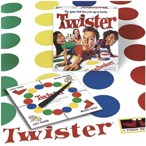 Twister is the game that ties you up in knots. Spin the dial and move a hand or foot to the colored circle on the floor mat. Can you get there' dont touch the mat with anything but a hand or foot. It is for 2 or 4 players. It includes a spinner, a mat and instructions. Instructions are available in English and Spanish.Over forty years old and going strong! Soon after its release in 1966, Twister was made instantly popular when Johnny Carson and Eva Gabor played it on The Tonight Show. Such a simple concept, with so much potential for hilarity. The game includes a plastic mat with red, blue, yellow, and green spots; a spinner; and instructions. To play (as if you didn’t already know…), two to four players face each other, with the plastic mat in the center. A referee spins the spinner, then calls out the body part and the color the arrow points to ("Left foot, blue," "Right hand, yellow"). All players, at the same time, follow the directions, placing the appropriate body part on a vacant circle. Players become increasingly entangled, until someone (or everyone) finally topples, and is eliminated. The last person standing—er, crouching—wins. If this doesn’t bring families and friends (and celebrities) closer together, we don’t know what does! Out-and-out fun. --Emilie Coulter